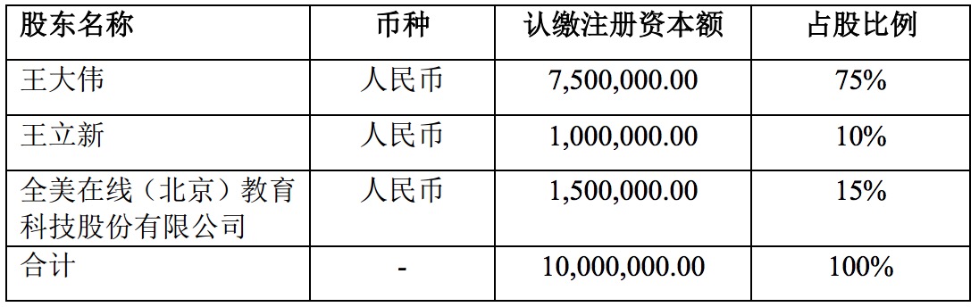 多知网9月12日消息,今日,全美在线发布公告称,拟以0元向王大伟收购其持有的北京国教融创教育科技有限公司(以下简称“国教融创”)15%(对应注册资本额 150 万元)的注册资本认缴额度。