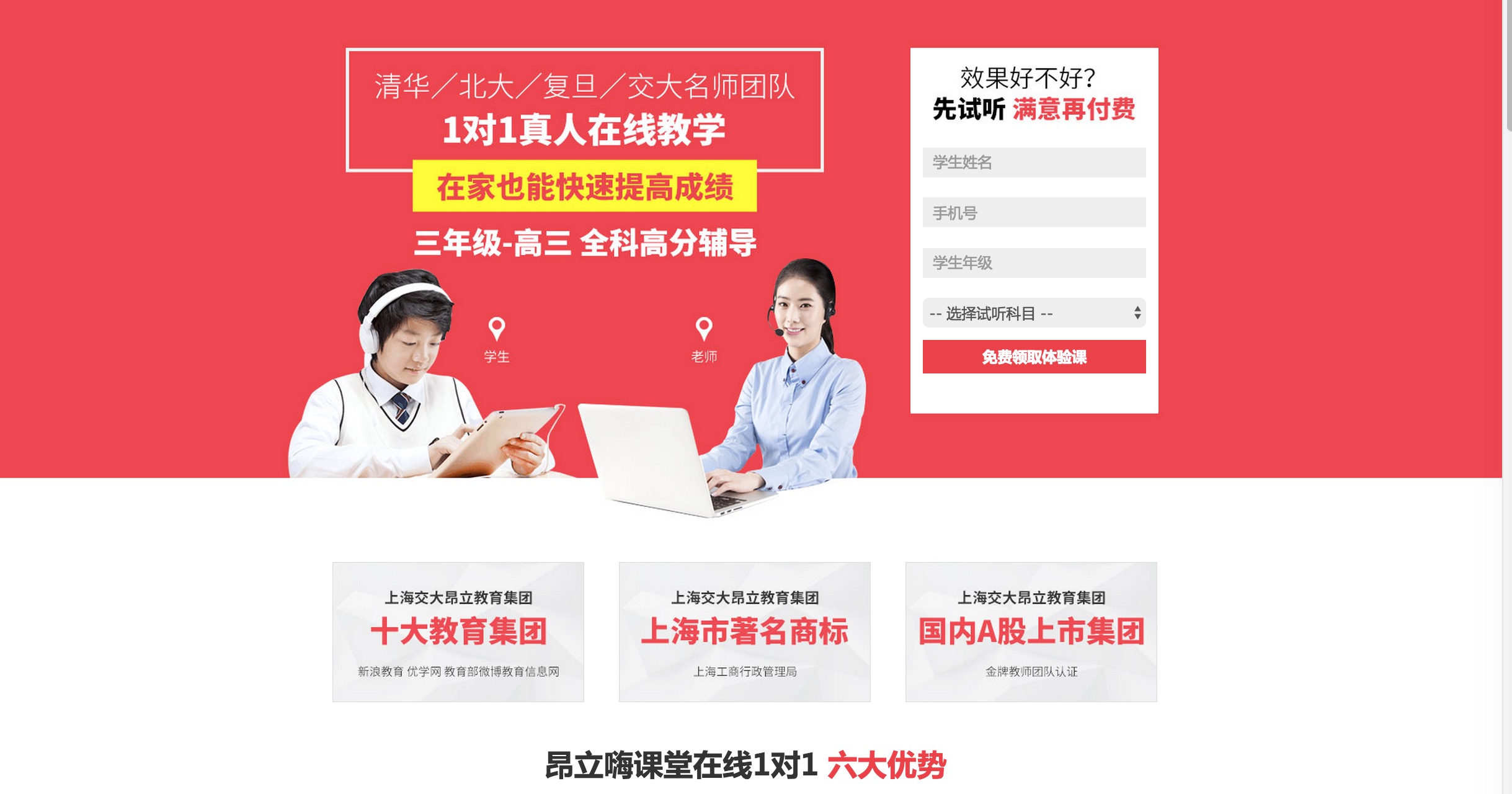 官网显示,昂立嗨课堂开设中小学全科真人在线一对一辅导,教师主要来自清华、北大、复旦、交大等,课程包括三年级-高三阶段的全科辅导。服务包括学科提分、升学指南、在线辅导、个性诊断、学科作业答疑等。学生可在官网上报名领取体验课,先试听满意后挑选或购买课程。