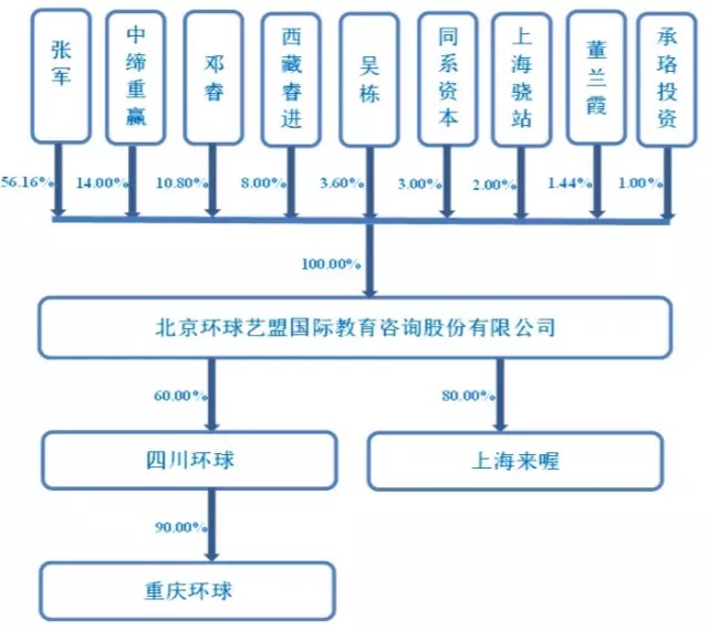资料显示,环球艺盟董事长张军持有公司56.16%以上的股权,为实际控制人。截至2016年8月25日,公司(母公司、分公司)员工共有227人。其中,市场部有72人,占比31.72%;教学部有54人,占比23.79%。