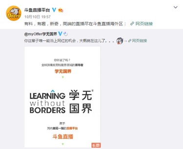 多知网10月11日消息,近日,跨境教育服务平台学无国界与斗鱼TV达成合作,将在留学生群体中招募、培养主播,展示留学生活方式,布局海外直播市场。
