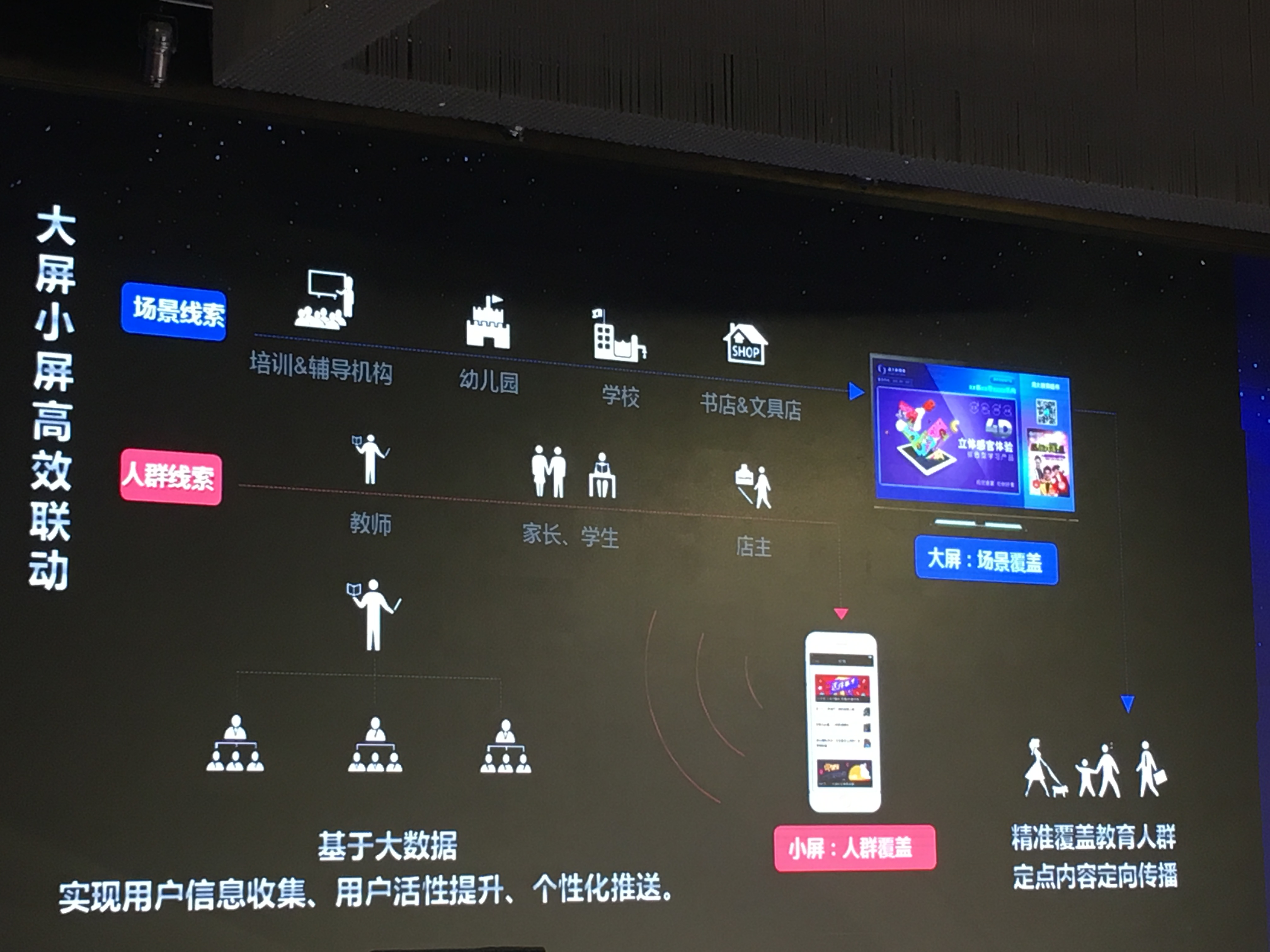 线下则是与幼儿园、培训机构、文具店、书店合作,通过在达成合作的线下场所安装清大世纪与海尔合作研发的大屏幕,并与手机终端配套,实现大小屏联动。