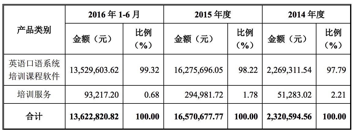 报告期内,公司营业收入来自于跨平台英语口语系统培训课程软件的销售和相关培训服务。其中,英语口语系统培训课程软件2014年、2015年、2016年 1-6月营业收入分别为226.93万元、1627.57万元、1352.96万元;培训服务2014年、2015年、2016年1-6月营业收入分别为5.13万元、29.5万元、9.32万元。