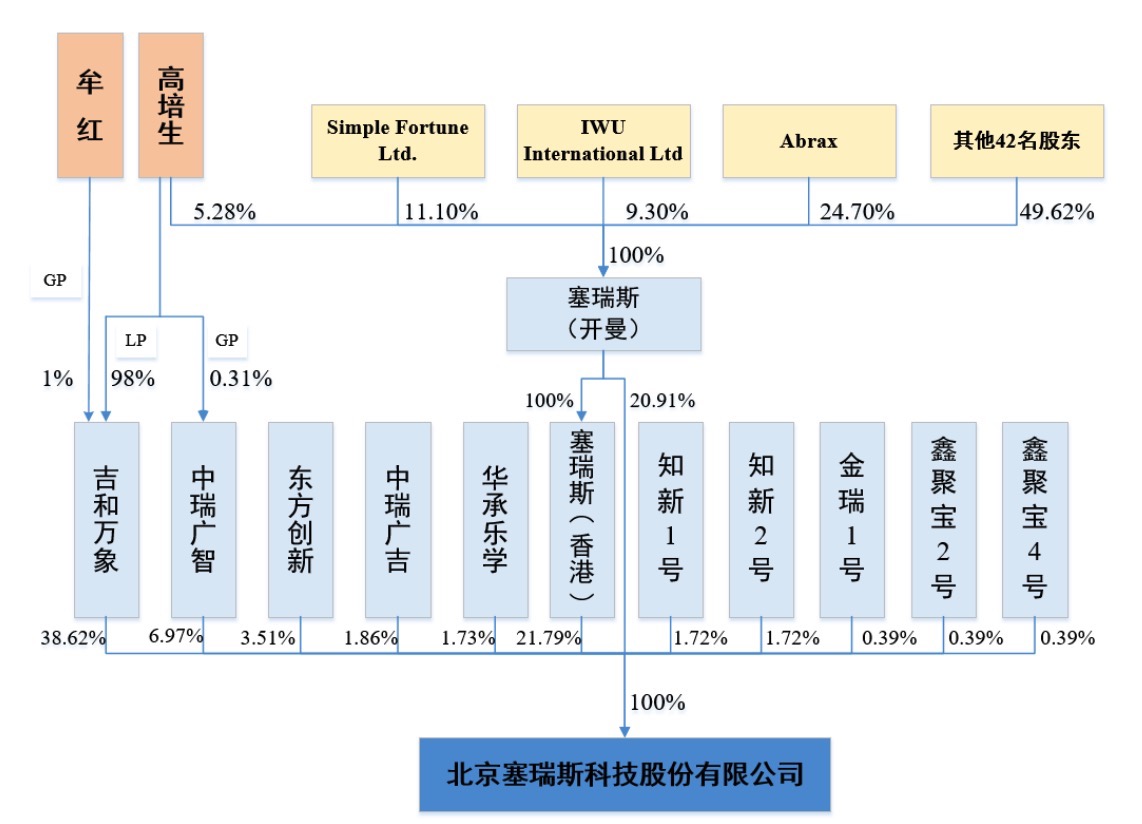 报告披露, 塞瑞斯12名股东股权较为分散,除吉和万象持股权比例为38.62%外,其他单一股东持股均未超过25%。吉和万象的持股比例构成相对控股,为塞瑞斯的控股股东。报告称,2015年10月,高培生通过股权转让及增资成为塞瑞斯实际控制人,牟红与高培生系夫妻关系,因此,高培生和牟红为公司的共同实际控制人。