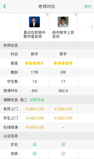 据轻轻家教官方介绍,新版本中的“老师对比”功能,将老师的星级、教龄、学生数、授课时长、价格、好评数、评价标签、作业预习布置的数量、助教推荐次数、距离等等详细数据进行对比,方便家长根据对比信息,判断老师水平。