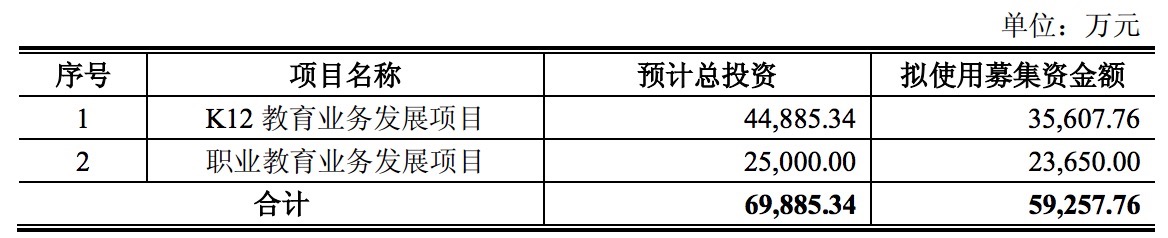 公告显示,本次非公开发行拟募集资金总额不超过5.93亿元(含5.93亿元),扣除发行费用后的募集资金净额中的3.56亿元用于K12教育业务发展项目,2.37亿元用于职业教育业务发展项目。募集资金投资项目的具体情况如下: