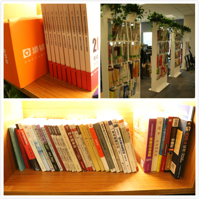 一个做教育产品的机构怎么可能没有书?在猿辅导的书架里陈列着猿辅导研发的教材、在市面上购买的用于教研的书,以及员工自己贡献的书籍。看看这书目,从英语到历史,从政治到文学,还有刘同的鸡汤,大伙的涉猎真广泛。