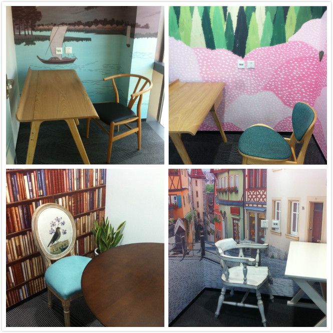 20间直播室是20种不同的装修风格,有湖上小舟、花草树木、复古书房、异域街道……桌椅也根据壁纸的内容配置相应的款式。