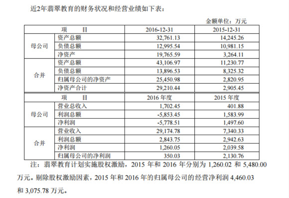 翡翠教育2015年和2016年的营业收入分别为7340万元、2.92亿元,净利润分别为1260万元,2040万元,归属母公司的净利润分别为2131万元、350万元。