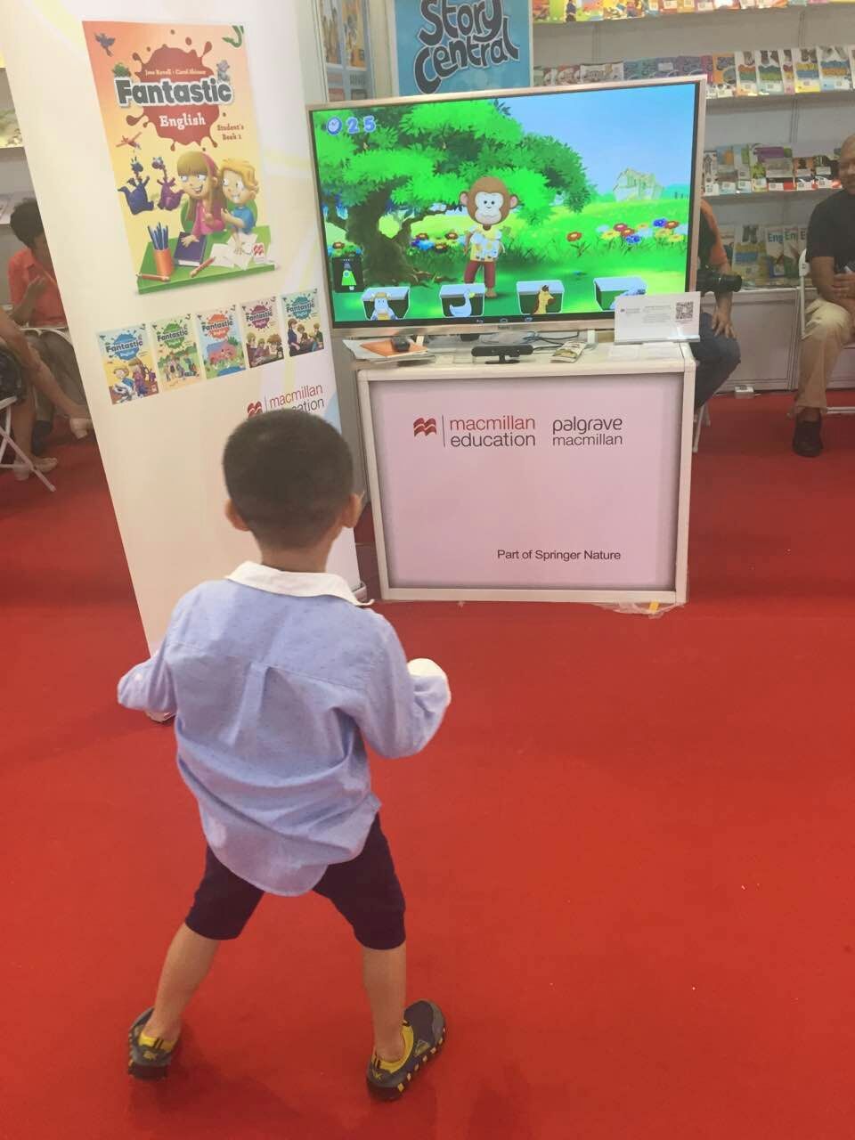 多知网体验嘿哈科技与麦克米伦合作产品,有多重呈现形式,通过在电视机前的摄像机读取到的手势,可以做出翻书、举手选择、抛物选择等动作。另外,也有一些根据书的内容改编的听音选图等交互小游戏。
