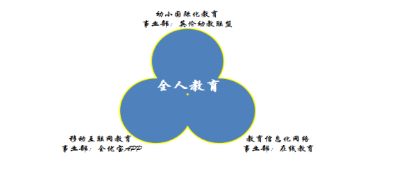 全人教育下设幼小国际化教育事业部、移动互联教育事业部、教育信息化网络事业部三大事业部。