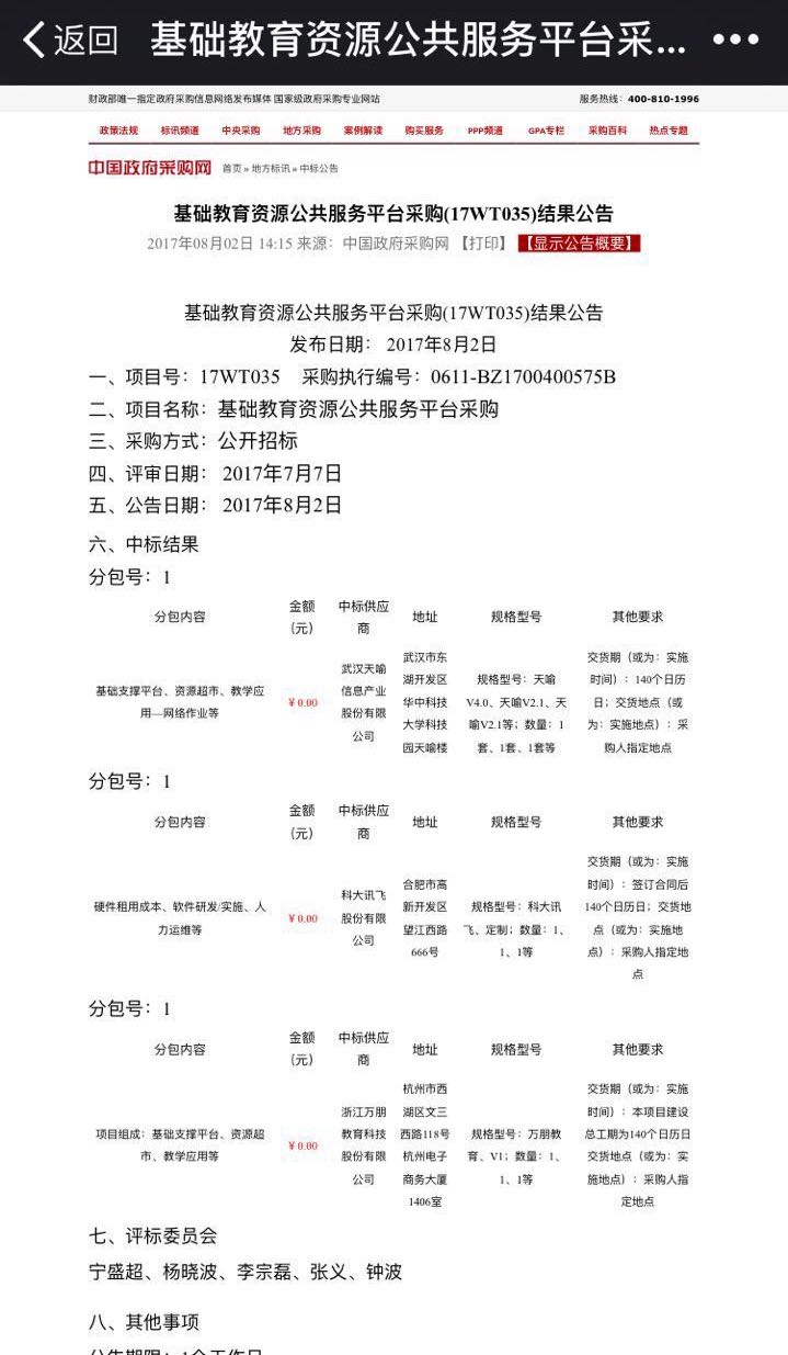 多知网8月14日消息,近日,根据中国政府采购网发布的中标结果公告,武汉天谕、科大讯飞、浙江万朋以0元中标重庆市教育委员会的基础教育资源公共服务平台采购项目。