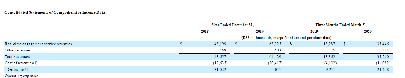 招股书显示,声网Agora营收从2018年的4,366万美元,增长至2019年的6,443万美元,增幅48%。2020年第一季度营收3,556万美元,比2019年第一季度的1,336万美元兑增166%。