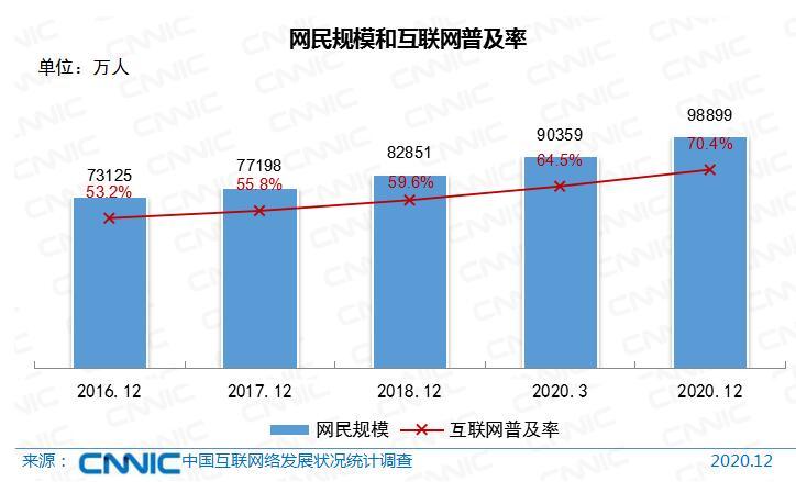 多知网2月3日消息,今日,中国互联网络信息中心(CNNIC)在京发布第47次《中国互联网络发展状况统计报告》。报告显示,截至2020年12月,我国网民规模达9.89亿,较2020年3月增长8540万,互联网普及率达70.4%,较2020年3月提升5.9个百分点;在我国网民群体中,学生最多,占比为21%。
