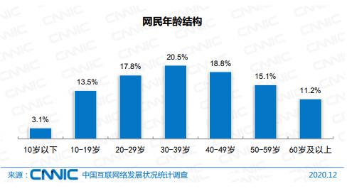 截至2020年12月,网民增长的主体由青年群体向未成年和老年群体转化的趋势日趋明显。网龄在一年以下的网民中,20岁以下网民占比较该群体在网民总体中的占比高17.1个百分点;60岁及以上网民占比较该群体在网民总体中的占比高11.0个百分点。