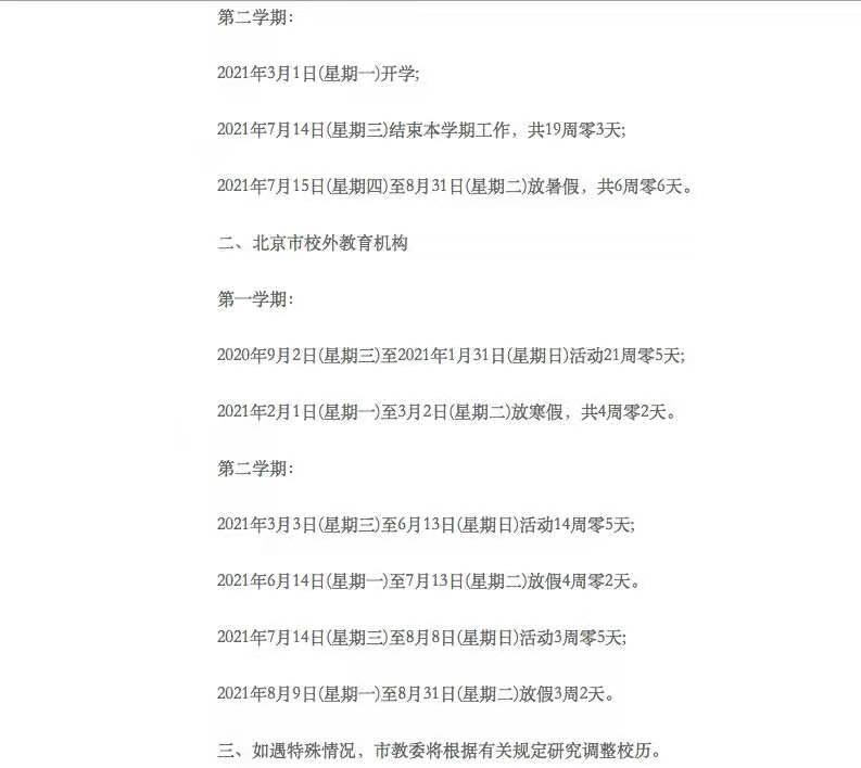 据了解,此前北京市中小学开学时间与北京市教委公布的2020—2021学年度校历时间一致。依据校历,北京市中小学第二学期开学日期定为2021年3月1日,本学期自2021年3月1日至7月 14日,共19周零3天。2021年7月 15日至8月31日放暑假,共6周零6天。
