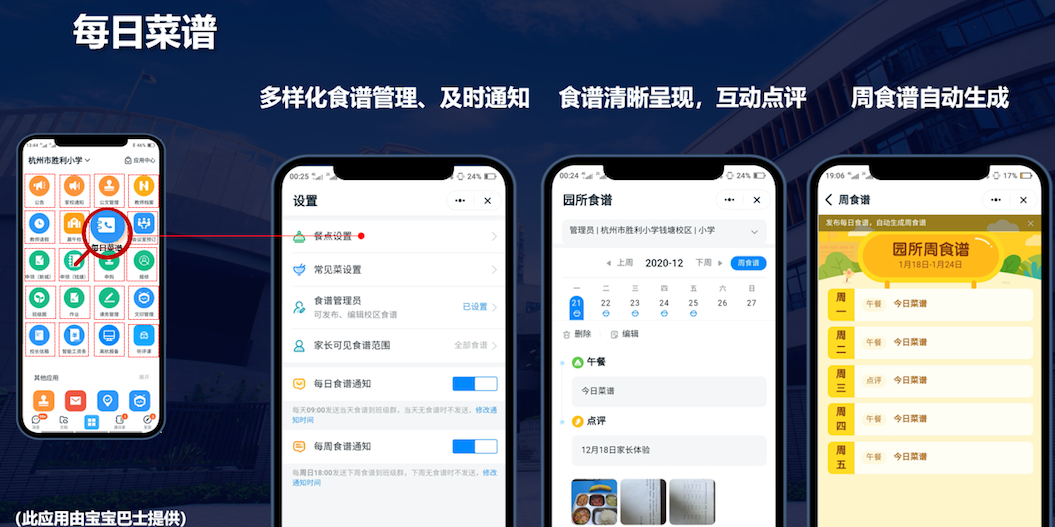 以学生就餐场景为例,家长以前不清楚孩子每天在学校吃得怎么样,现在通过“胜利钉”上的“每日菜谱”应用呈现展示,家长不光可以看到饭菜,还可以点评。如果发现有需要提升的地方,可以生成反馈流程直接发给相关负责人,快速得到响应和优化,整个过程通过数字化的方式透明公开。