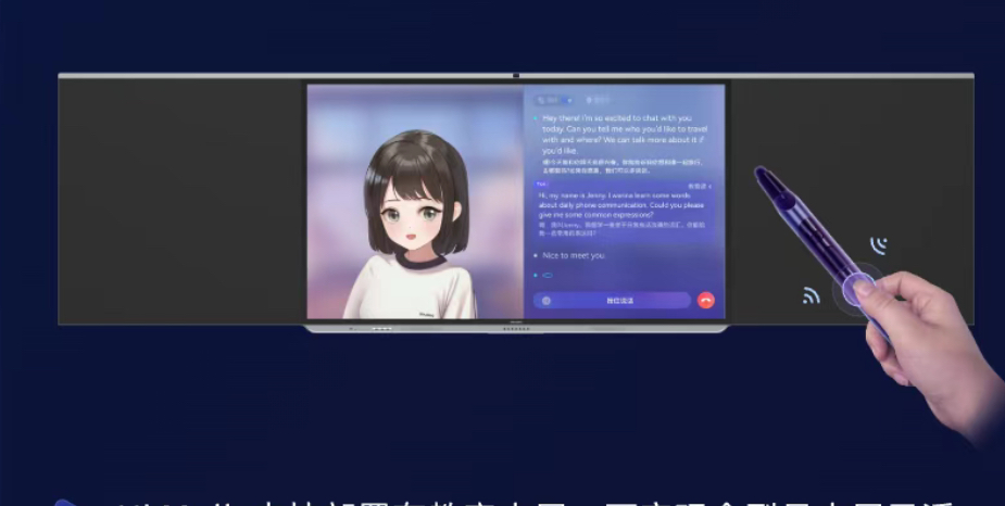 Hi Molly支持部署在教室大屏,可实现全型号大屏灵活使用,同时配备智能教鞭,方便教室内清晰收音和对话;同时,为了配合老师提供口语练习环境,在课堂上Hi Molly可以进行英语话题的延展、讨论、展示等。