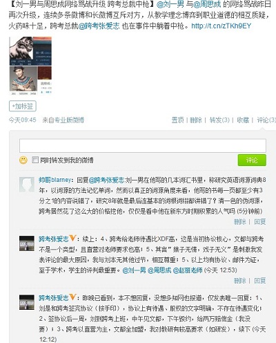 昨日周思成称刘一男离开新东方后联系跨考,上午签约下午就毁约,以此质疑刘一男的职业道德。