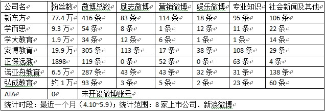 样本为在美股上市的八家教育公司,时间区间为最近一个月(4月10日至5月9日),统计指标为粉丝数、该时段内发布的微博总数和微博内容类型。