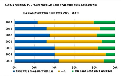 主流学界对在线教育的认可度也迅速提高:2800所高校中,77%的学术领袖认为在线教育和面授教育无区别(约55%)甚至更好(约22%);十年前,56%的学界人士认为两者效果相同(约44%),或在线教育更好(约12%)。(如图2)