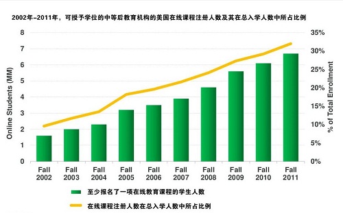 在线教育增长迅速,2011年32%的学生至少报名了一项在线教育课程,十年前这一比例仅为8%;在线课程注册学生数占比,也从十年前的10%左右,增长到超过30%。(如图一)