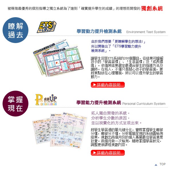 拓人创建了ETS心理环境测试、PCS学力诊断测试和BCS信心三大系统。通过这三大系统构架一个封闭的学习流程,实现因材施教。
