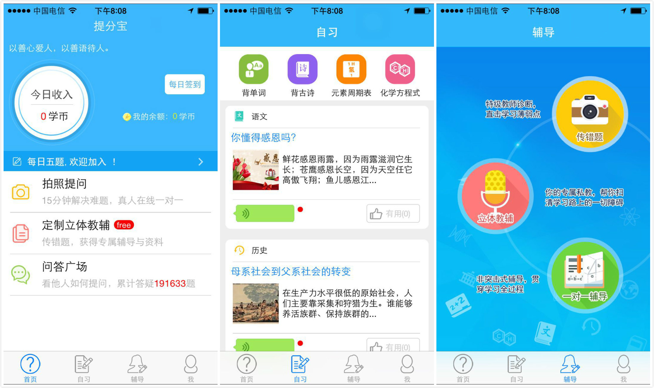 另外市场上大多产品或者辅导机构都是以理科居多,提分宝这款产品上面还多了文科学习,有背单词背古诗这些带趣味性的工具,增加了学生的学习积极性。