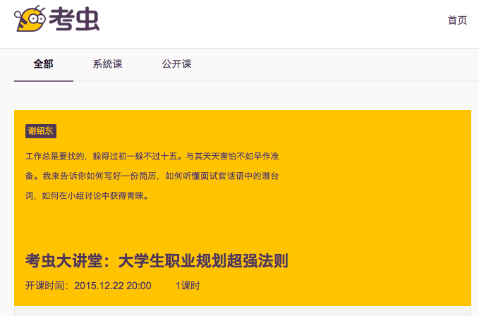 所以在考虫身上不难看到三个元素:第一,精品内容/服务策略;第二,高度标准化的课程体系;第三,做有情感,有温度的产品。