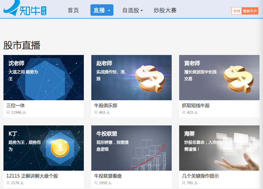 知牛财经定位股市达人直播互动平台,邀请知名操盘手等,通过视频直播的形式,向用户提供炒股教学指导。希望凭借其讲师的权威性、视频直播的高效性等因素,在财经股市资讯站中弯道超车。