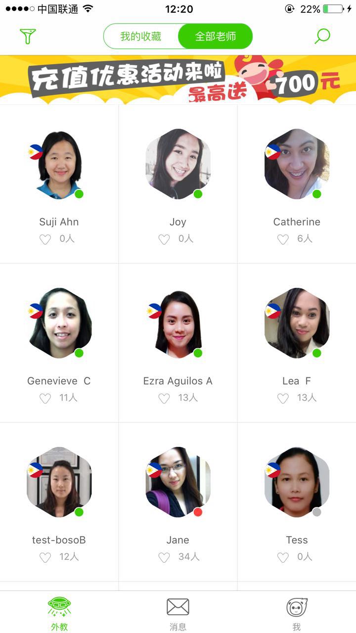 与其它几款语伴软件类似,在多狮口语的主界面上可以看到教师的国籍、在线状态及交流次数。另外,用户可以通过“上课目标”“特色”“口音”等选项筛选出更适合自己的老师。