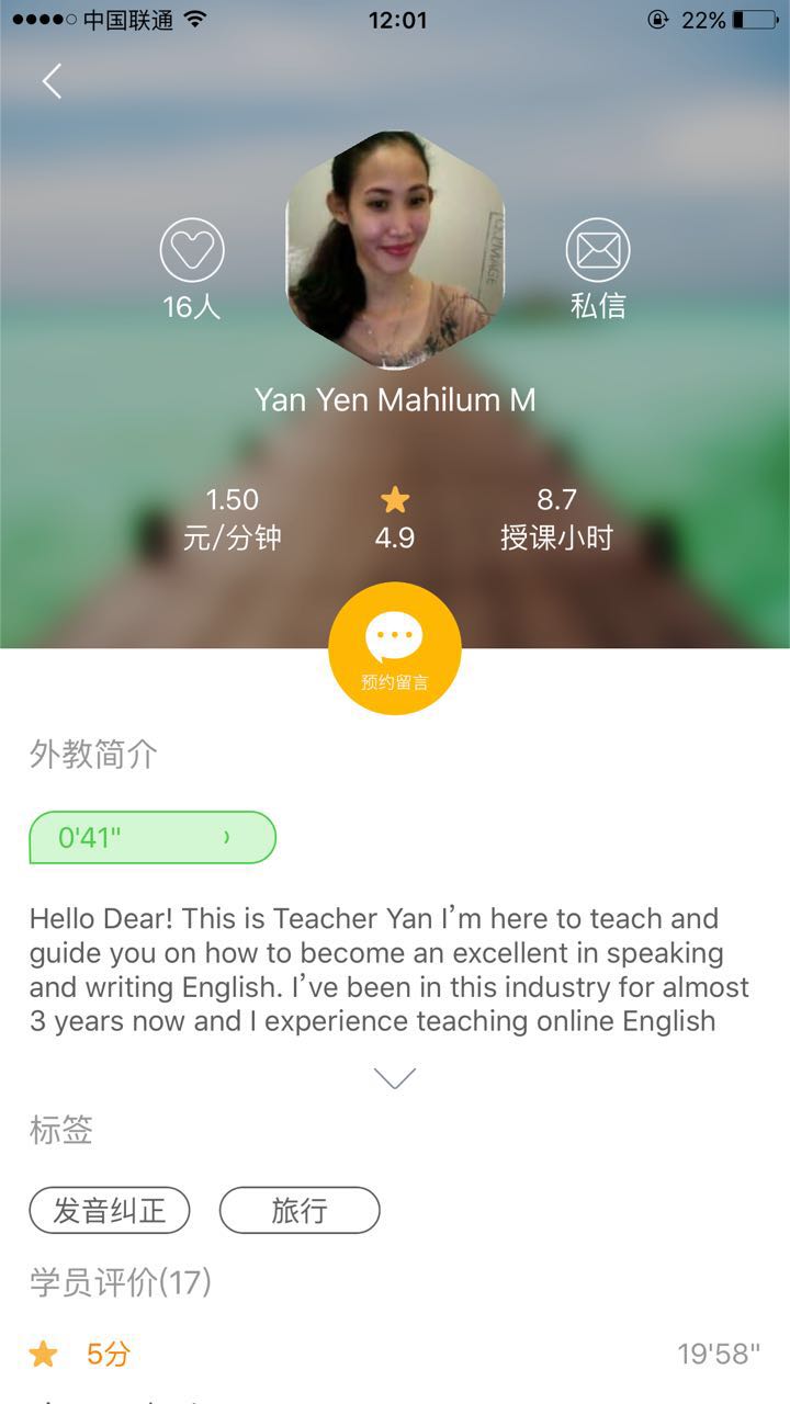 教师个人界面有语音及文字的个人介绍,教师标签及学员评价。目前大部分教师为菲律宾国籍,费用在1.5-3元每分钟。