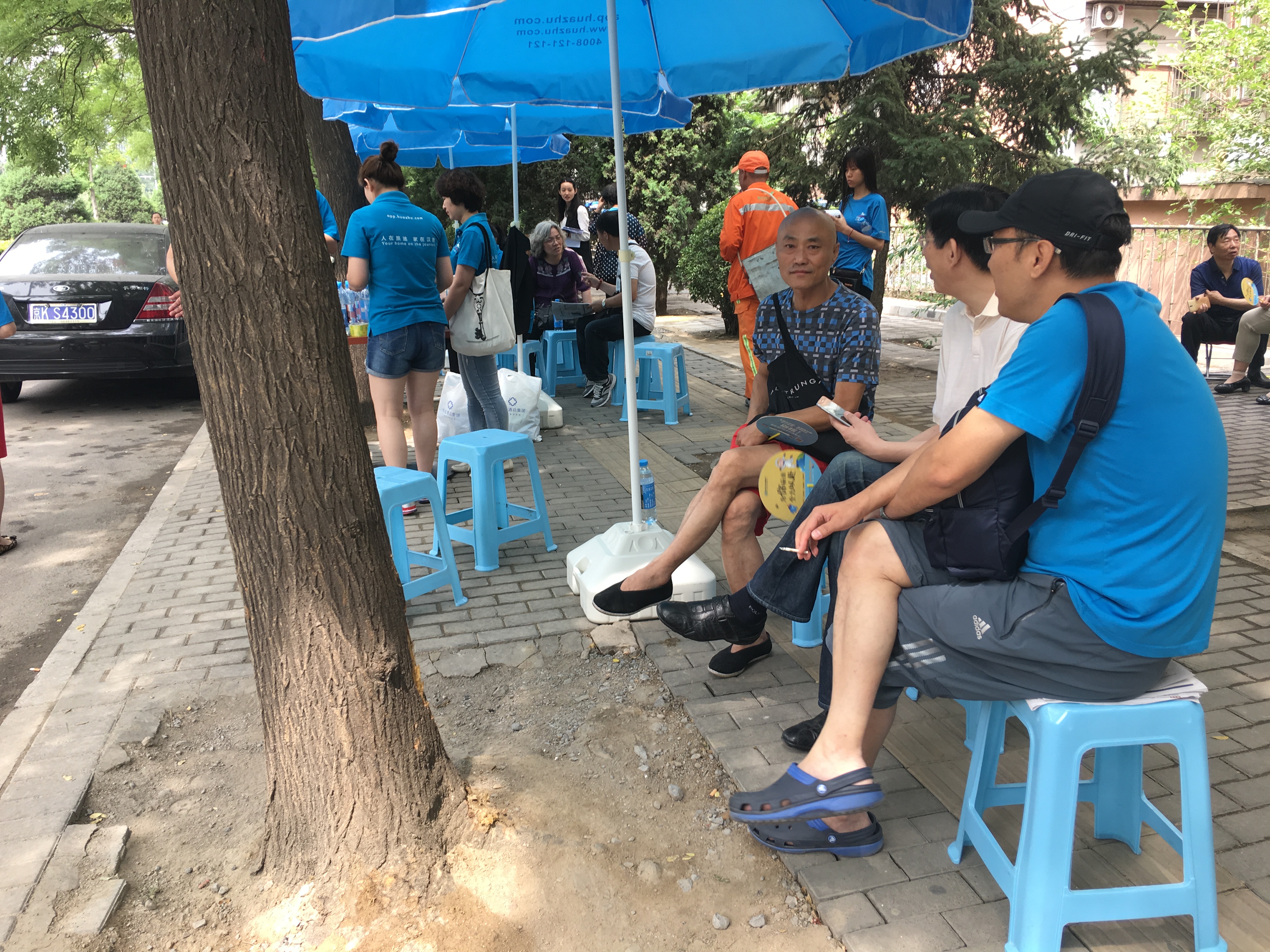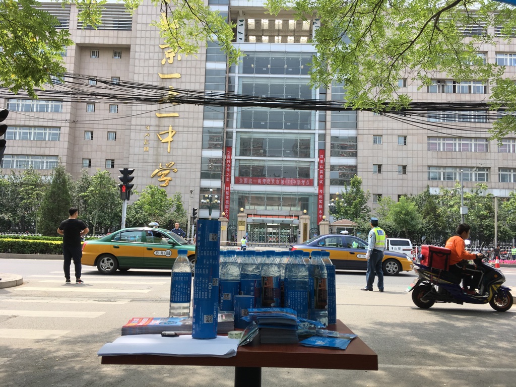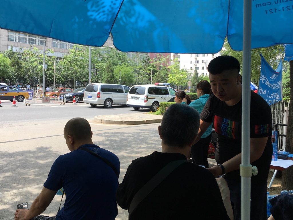 城管的小摊位也毫无悬念地出现在校门口30米处,之前的每年高考,北京城管都在全市考点设置爱心饮水站,并配备了急救箱,而这次考场附近没有见到发传单的机构,也是因为北京城管全程监控,禁止中小机构发放广告干扰考试学生。