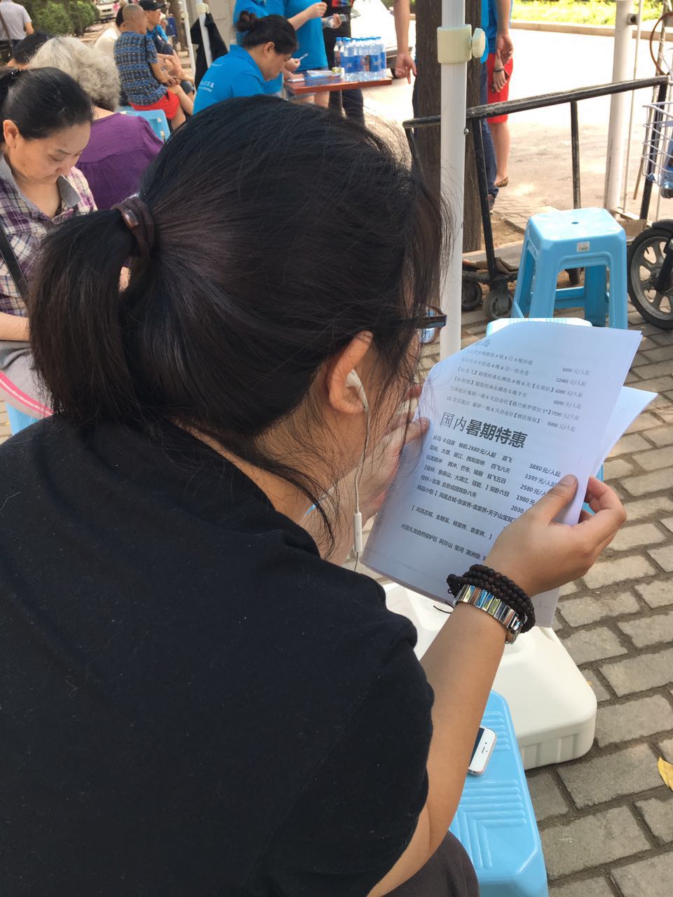 考试刚开始,家长们还没“缓过神儿”,一位家长用之前顺手接到的旅行宣传单打发时间。