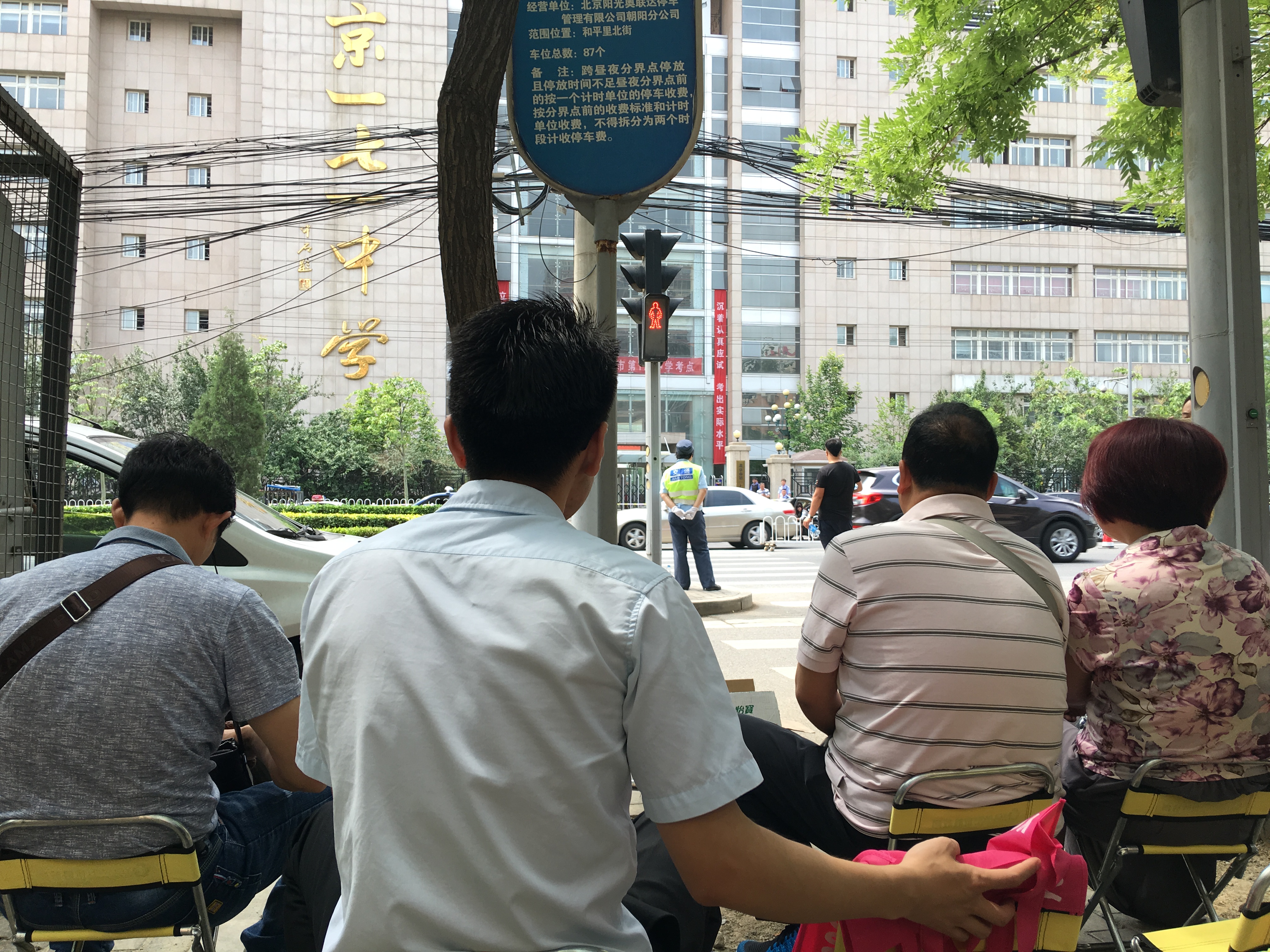 同几年前孩子在考场内奋笔疾书,家长在烈日下焦急等待的固定情节相比,今年的陪考规模却略显清冷:除了一些在私家车内等待的家长,一七一中学对面等待孩子的家长不足十人。