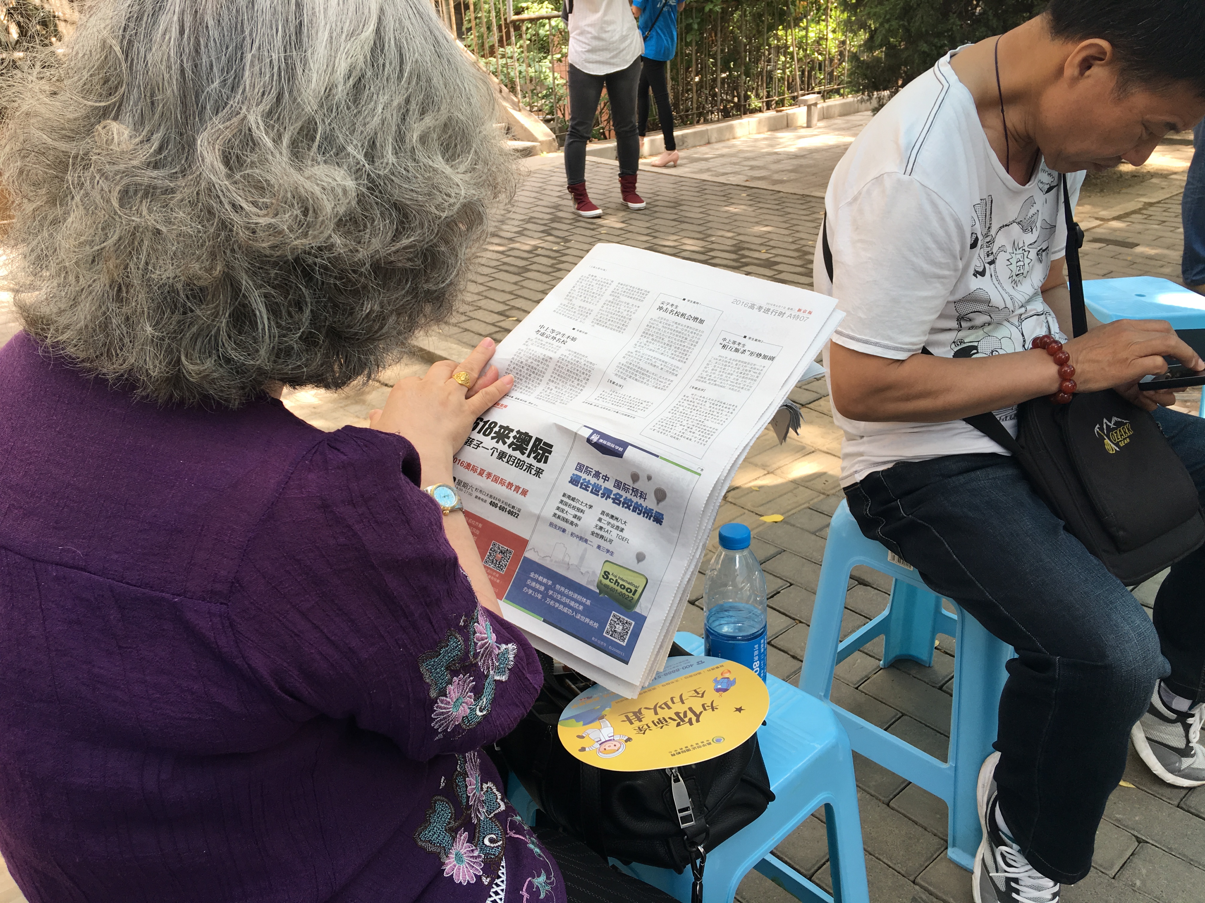 虽然如此,他仍然在积极地寻找和家长搭讪的时机。此时,他的手里只剩下了3把扇子,“不敢发了”,他说,“那些是明天的”。他望着袋子里的扇子,显得有些犹豫,是不是要用明天的物料把今天的任务先完成。