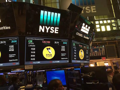 多知网6月11日消息,昨晚,51Talk在美国纽交所敲响上市钟声。51Talk开盘价为19.50美元,相比发行价涨2.6%;盘中该股最高上触20.84美元,最低下探至18.84美元;最终收报18.98美元,相比发行价19美元下跌0.02美元,跌幅0.1%。