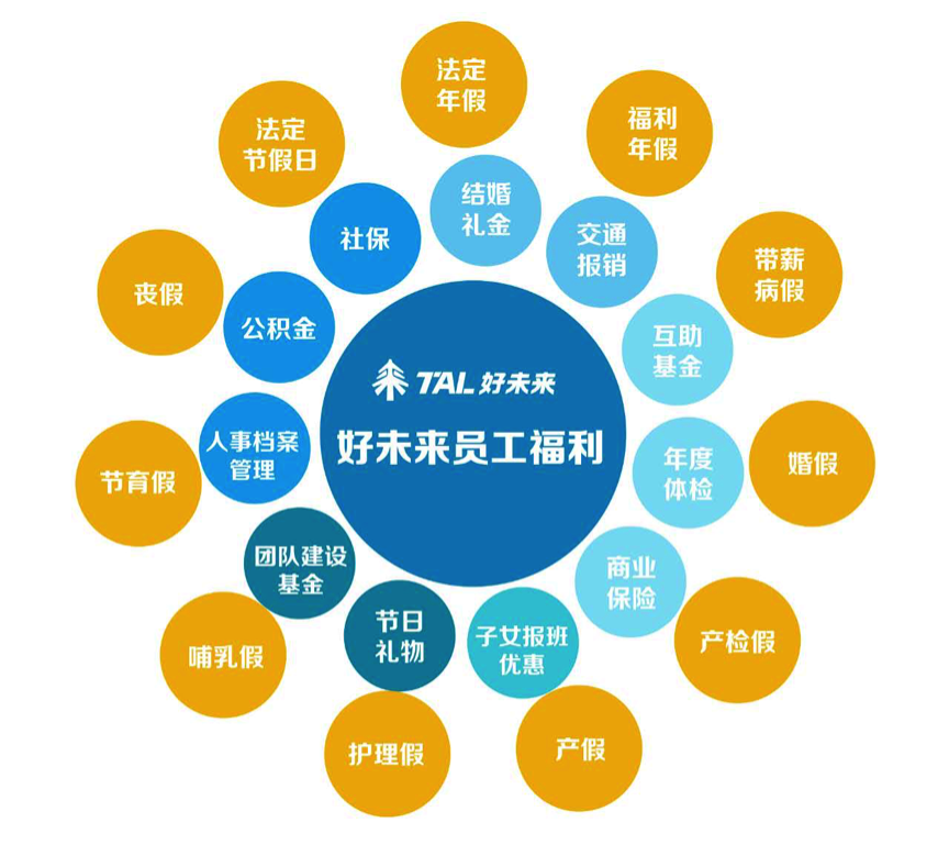 除了此次提高贷款额度至50万元外,好未来为员工提供了五险一金、互助基金、年度体检、团队建设等10余种福利以及包括法定节假日、法定年假、福利年假、婚假、产假等在内的11种假期。其中,子女教育优惠是好未来员工的“专有福利”,根据员工不同入职年限,子女享受旗下贯穿0至24岁的10余款教育产品(学而思、爱智康、励步、摩比等)0-9.8折优惠。