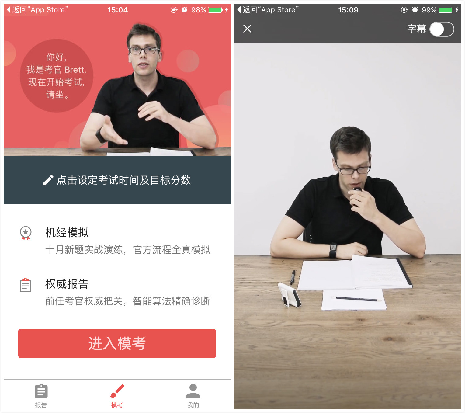 雅思流利说通过录制视频试题,模拟雅思口语考试场景。视频在需要用户作答处自动暂停,并对用户回答内容进行录音。用户回答完毕后可点击继续进行口语测试。模拟考试可以无限次进行。
