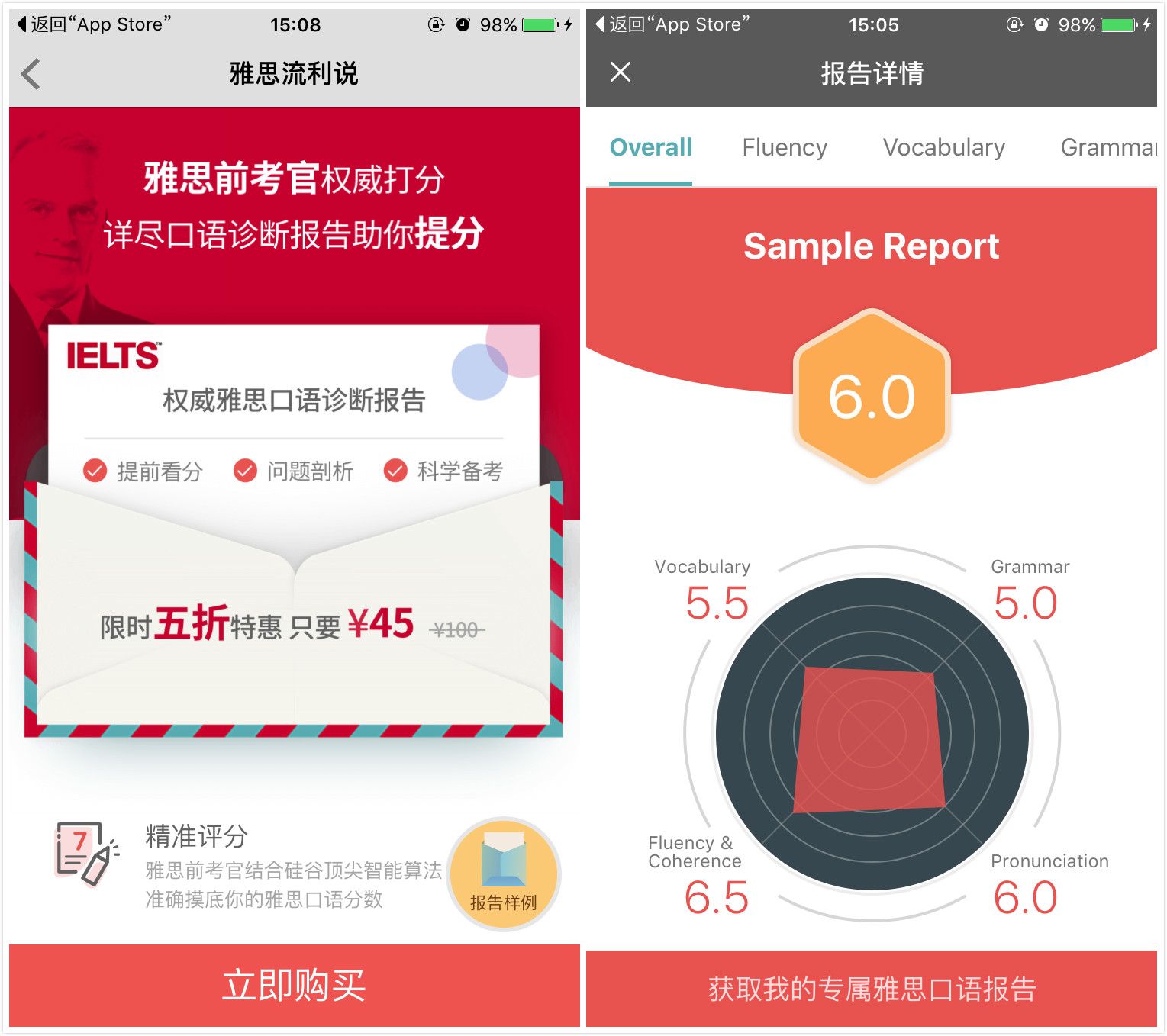 该口语诊断报告原价100元,近期限时特惠,售价45元。(多知网 徐佐君)