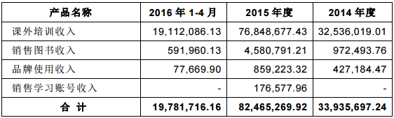 据公告数据显示,K12课外培训为大山教育主要营收来源,每年占总营收比例95%左右,2014年、2015年、2016年1-4月课外培训营收分别为3254万元、7685万元和1911万元。另外,这三个时间段内,销售图书营收分别为97万元、46万元和59万元,品牌使用营收为43万元、86万元和8万元。