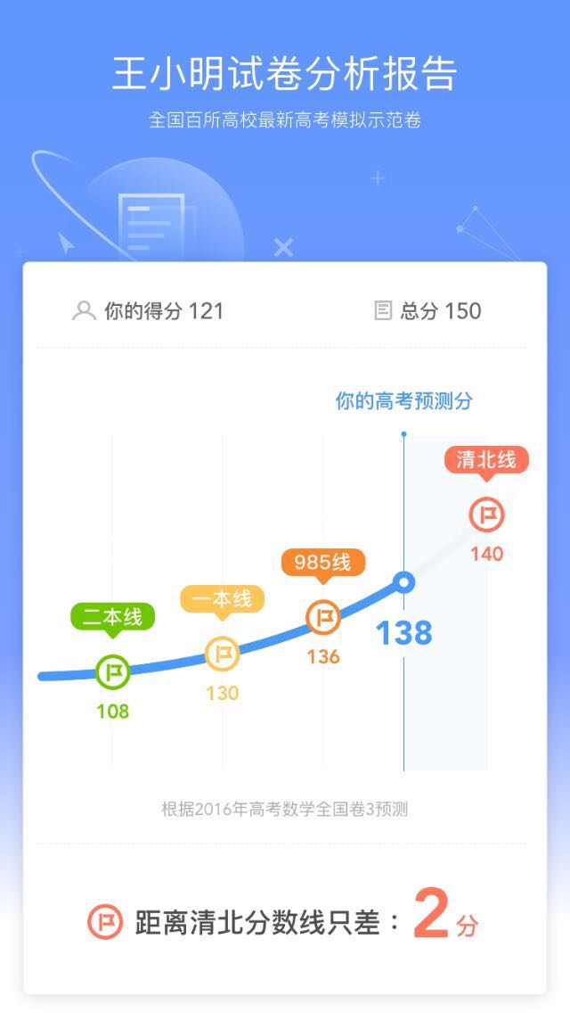 现在,学霸君的“试卷分析”已经上线并运行了几个月,现在,学生可以将自己的试卷拍照上传,学霸君的技术可以做到对整张试卷进行分析。分析报告中包括得分、与各档次学校的分数差距、试卷难度、排名、总体评价、知识点掌握程度、难易题得分情况、能力图谱、错因分析、核心错题分析等方面,并在最后给出最优提分方案(即学生在每个知识点需要的学习时间、核心题等)。