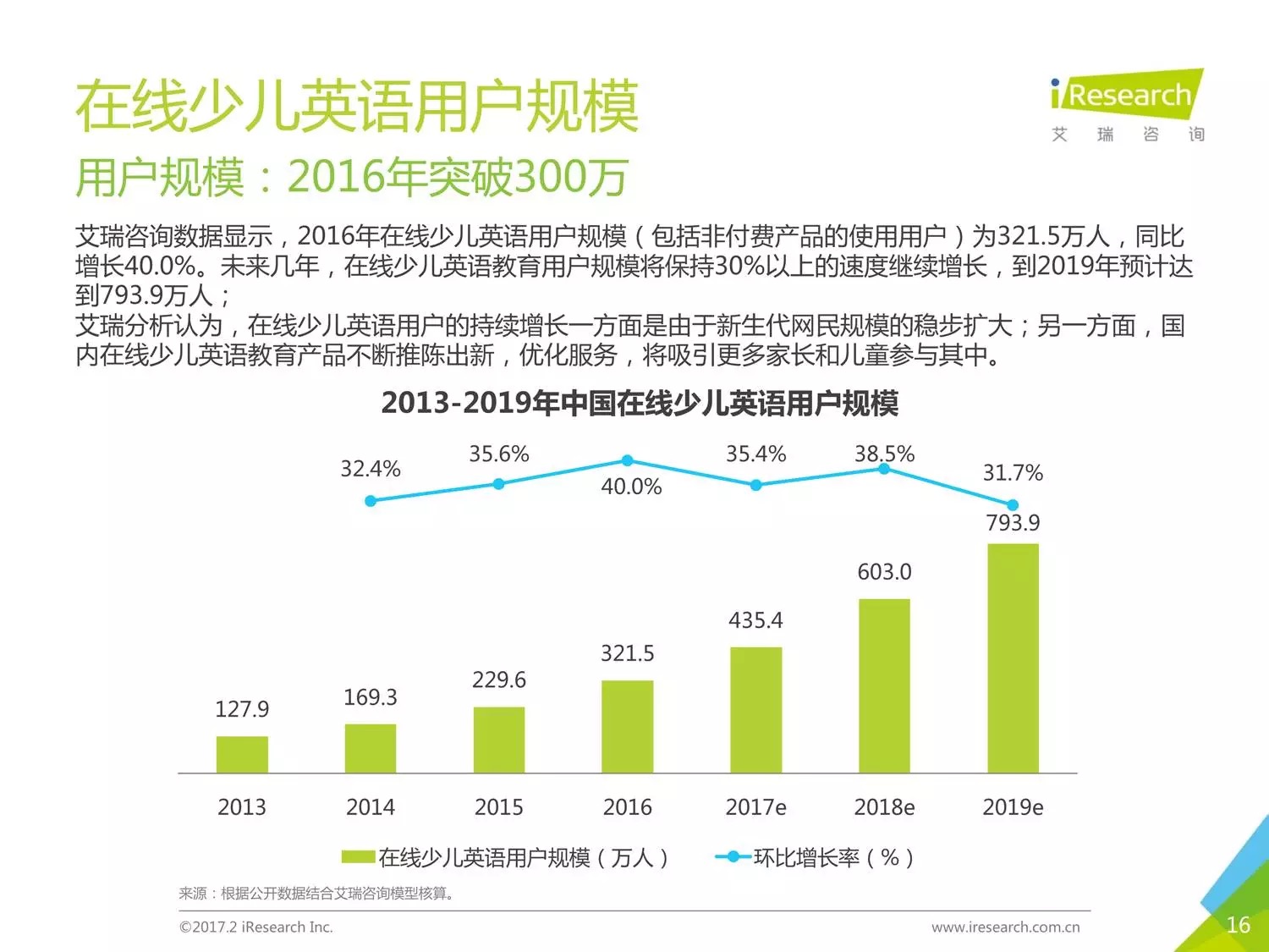 编者按:在线少儿英语一直是教育领域内的热门赛道,2016年在线少儿英语的市场规模接近20亿,用户规模突破300万。伴随着高新技术的诞生与互联网服务的提高,直播、VR等服务也渗透到了这个市场。随着资本的大量涌入,竞争也愈加激烈起来。本报告以时下几家比较受关注的公司为聚焦点,阐述了现在线少儿英语的发展状况。