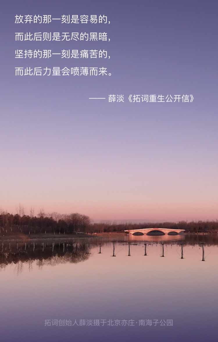 “但是,“薛淡补充,“不能让一棵树去承担一片森林的责任,不能逼迫一个背单词软件去肩负所有的事情,所以我把拓词归到顶上的一部分之中,它不再需要融资与变现,它的责任只是让你背单词。”