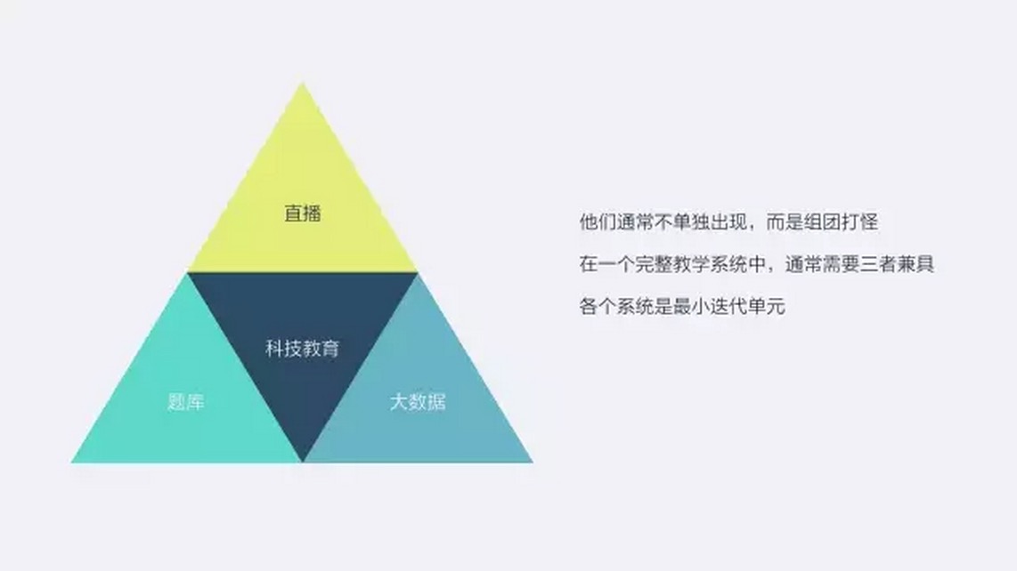 我们主要分享教育的数据延伸所带来的变化,以及我们的具体实践。数据是最终的结果,但是光靠数据不足以撑起第三代教育机构,还有两个强有力的助手,一个是直播,一个是题库。其中,直播是肌肉,题库是经络,数据是大脑。