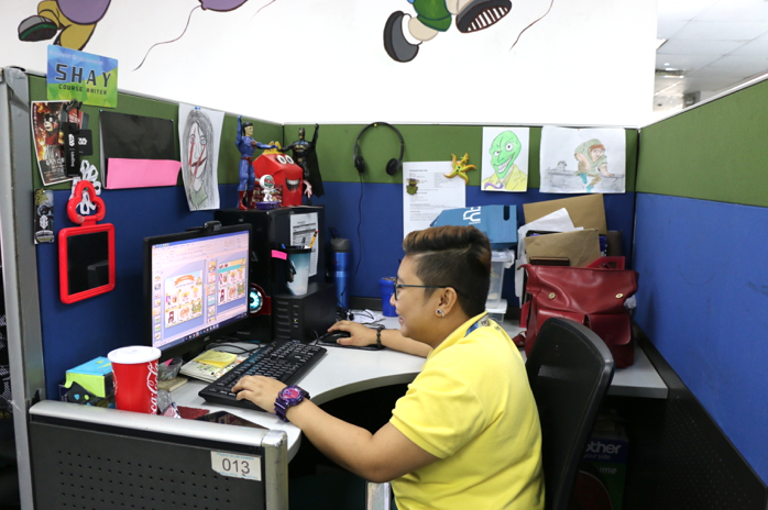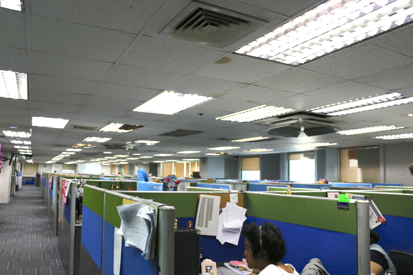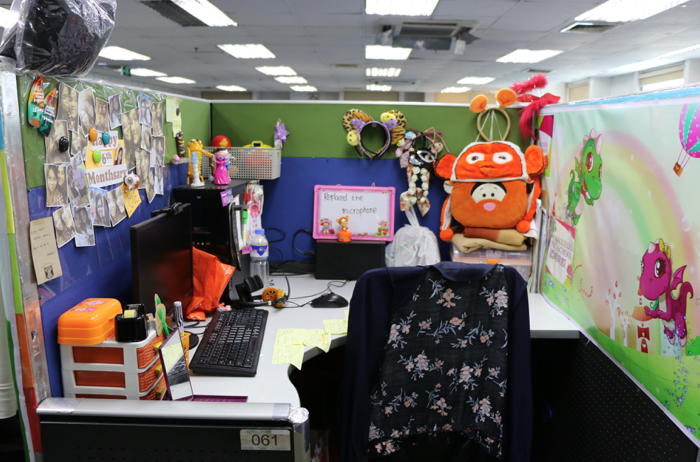 (办公室是这样的格子间,每个人在自己的工位办公)