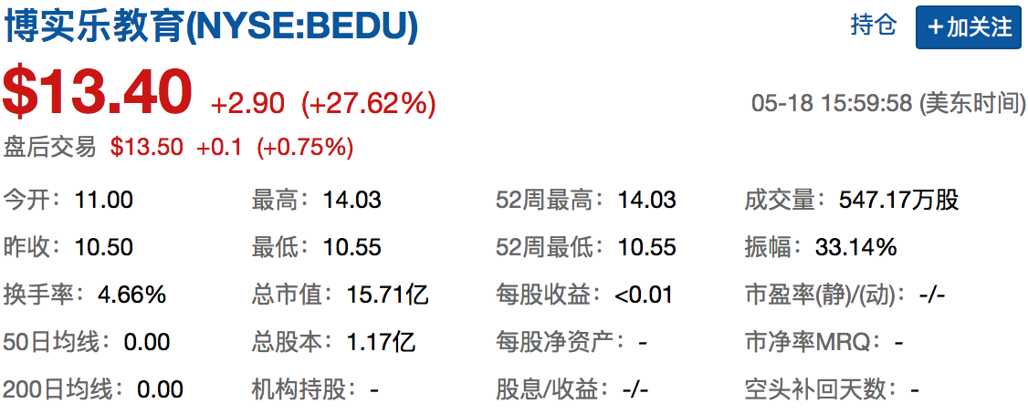 多知网5月19日消息,美东时间5月18日9:30,博实乐教育控股有限公司(Bright Scholar Education Holdings Ltd.)在美国纽交所主板(NYSE)正式挂牌上市,股票代码:“BEDU”。昨日股价最高达14.03美元。