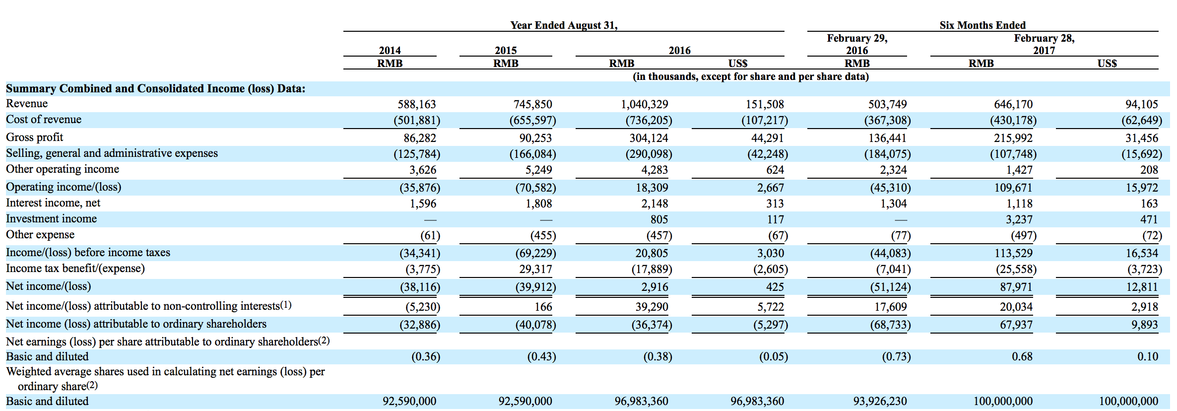 2017上半财年,博实乐教育实现营收6.46亿元。2014、2015、2016财年的营收分别为5.88亿元、7.45亿元和10.4亿元。同时,2016财年,博实乐教育实现盈利291.6万元,同比转盈。以下为2014财年-2017上半财年博实乐教育的经营数据:
