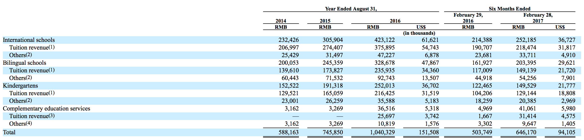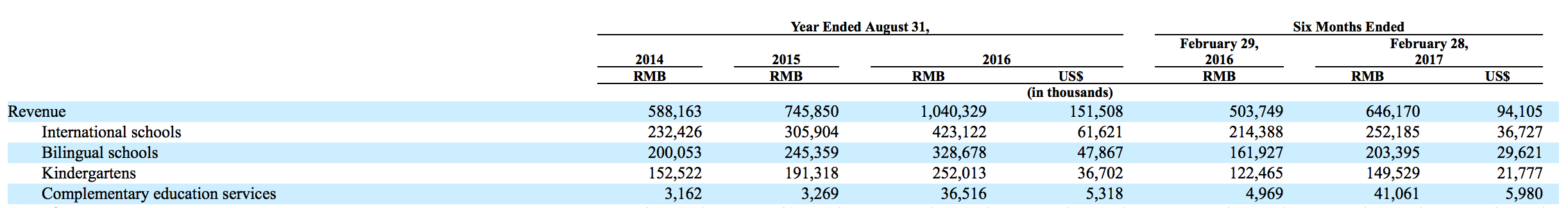 公告显示,博实乐教育实现营收的原因是学费的提高和学生数量的增加。2014、2015、2016财年国际学校、双语学校、幼儿园和义务教育阶段的学费收入构成如下: