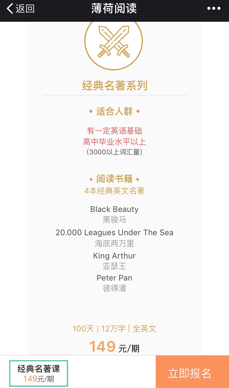 薄荷阅读(原名“百词斩阅读”)上线于2016年6月,现第13期百日训练营已进入报名阶段,共包含《黑骏马》、《海底两万里》等四本名著,学费为149元。