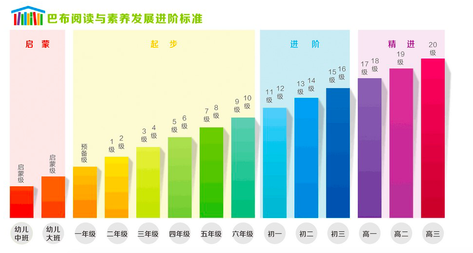 巴布阅读主要包括巴布精度课程,巴布阅读指导,巴布阅读馆三个内容,从阅读氛围和阅读指导方向提供服务,以下为巴布阅读素养发展进阶标准:
